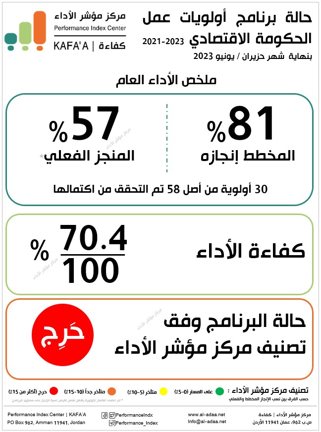 أصدر مركز مؤشر الأداء تقريره النصف سنوي والخاص بمتابعة أداء حالة برنامج أولويات عمل الحكومة الاقتصادي 2021-2023، والذي أظهر اكتمال 30 أولوية من أصل 58، وبمعدل كفاءة أداء مقداره 70.4%، حيث بلغت نسبة الانجاز الفعلي 57% مقارنة بـ 81% كنسبة إنجاز مخطط بنهاية شهر حزيران / يونيو 2023. وخلال عام ولنهاية شهر حزيران 2023، بين التقريرأن نسبة التقدم بالإنجاز الفعلي بلغت 32.9% وتحسن بمعدل كفاءة الأداء مقداره 14.5% نتيجة اكتمال 15 أولوية، مع ثبات تصنيف البرنامج عند المستوى الحرج حسب التصنيف الخاص بالمركز لأداء البرامج والمشاريع لعدم تقلص الفجوة ما بين الانجاز المخطط والفعلي.