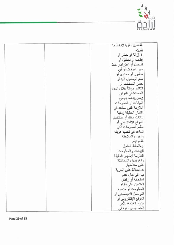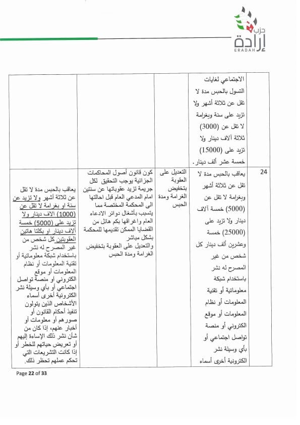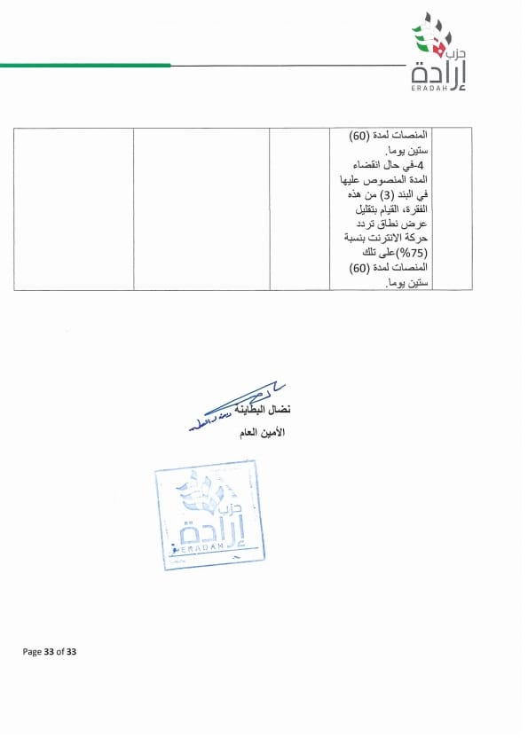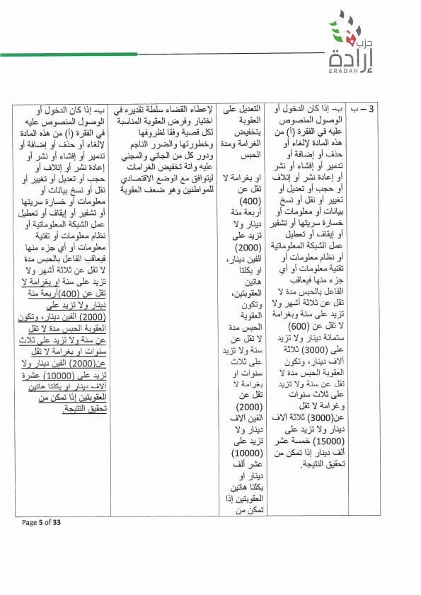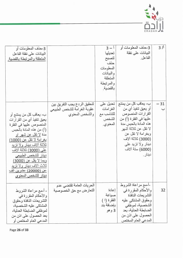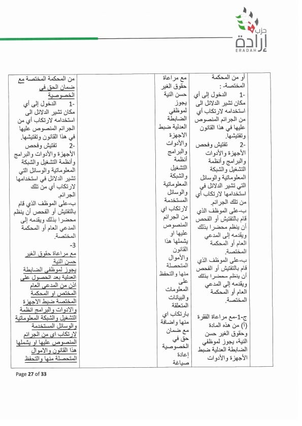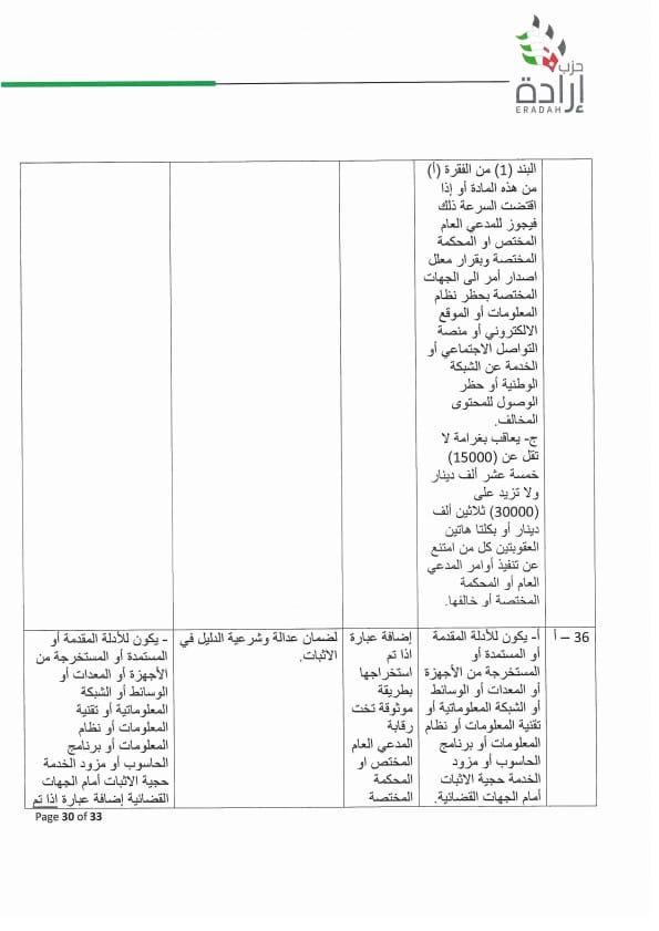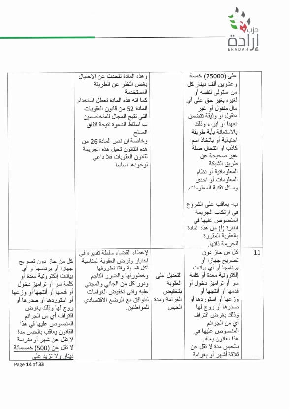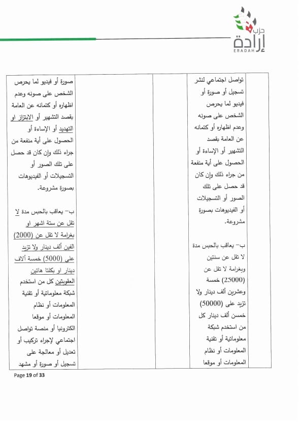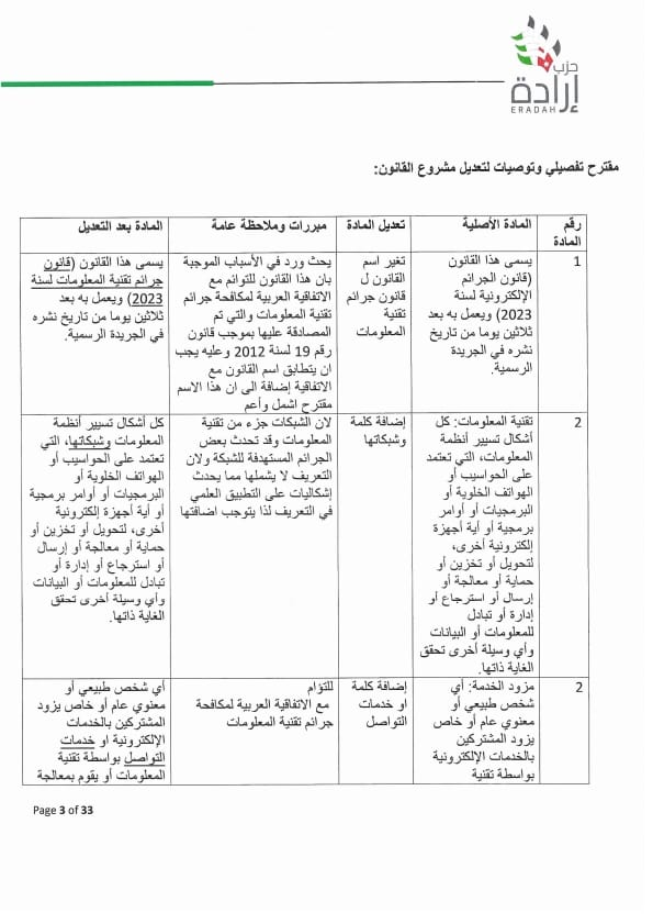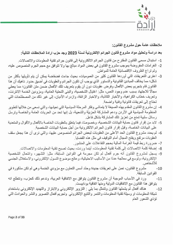 وجه الأمين العام لحزب إرادة نضال البطاينة كتاب لرئيس مجلس النواب مرفق به موقف تفصيلي للحزب من مشروع قانون الجرائم الإلكترونية لسنة ٢٠٢٣ ، وأوضح البطاينة أن الموقف جاء على ضوء دراسة مستفيضة للمشروع من قبل مختصين من أعضاء الحزب من إعلاميين وقانونيين وتقنيين وسياسيين، ومشاورات مع عدد من أعضاء الهيئة العامة للحزب والنواب من أعضاء الحزب.