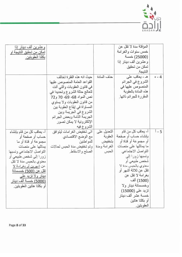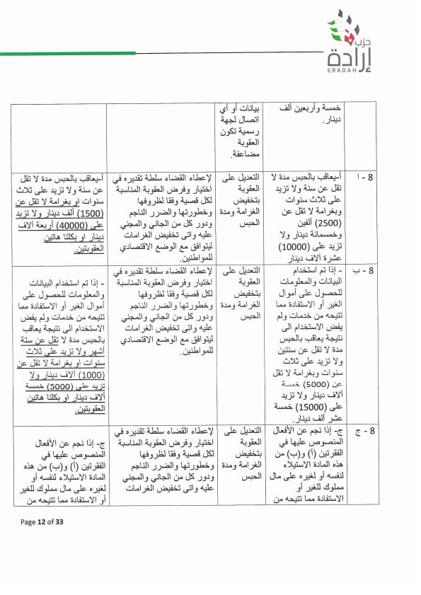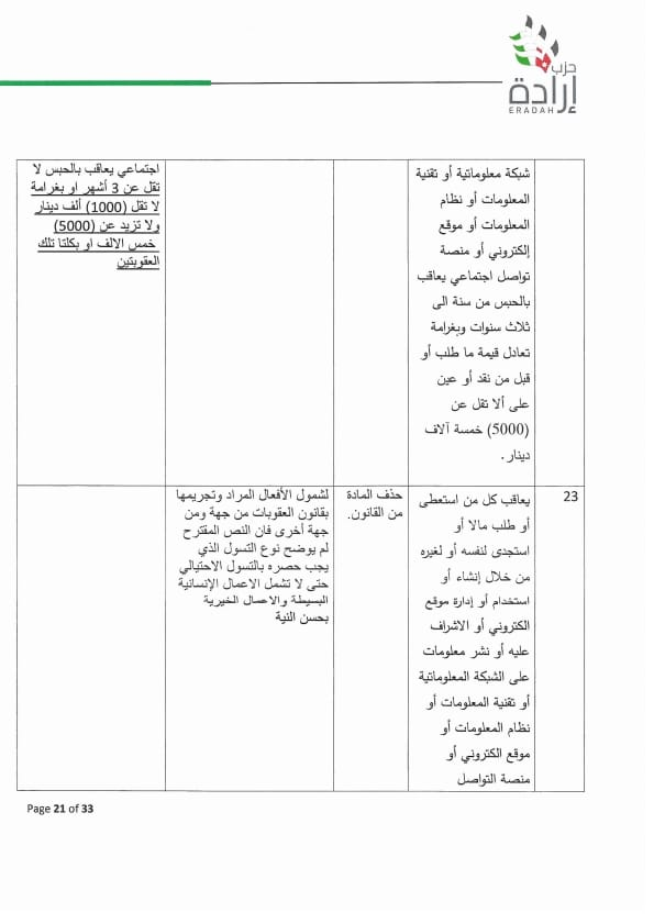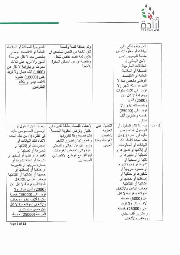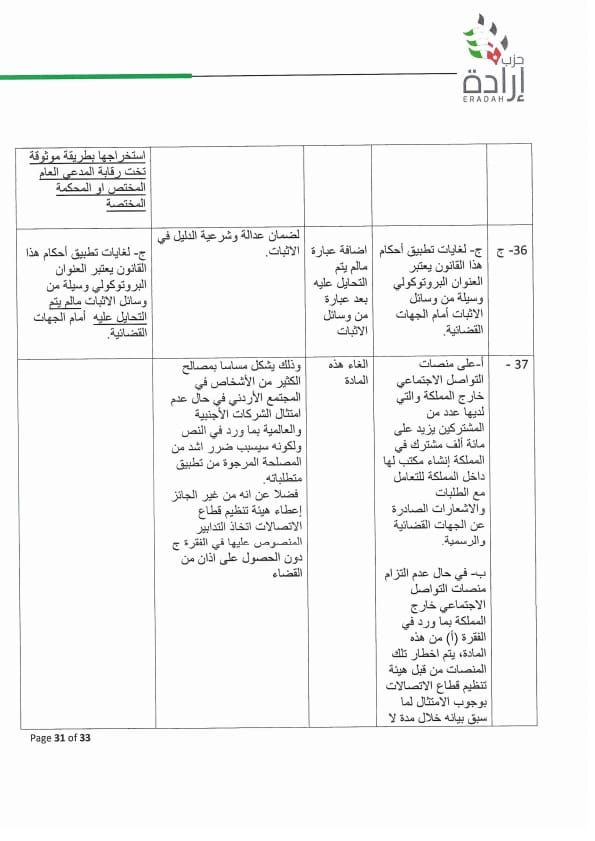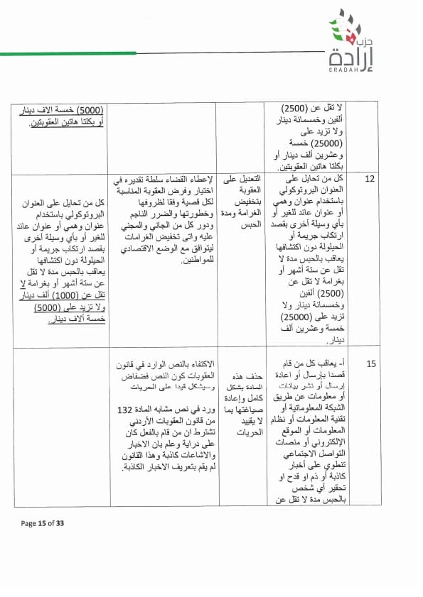 وطالب الحزب بسحب مشروع القانون وفتح حوار وطني بخصوصه ، أو أن تتم معالجة عدد من المواد بتعديلات مقترحة متضمنة بورقة موقف الحزب لتدارك اخطاء وقصور قانوني وتقني ومبالغة في العقوبة لا يجوز ان يتضمنها القانون بصورته النهائية وخصوصا وإن البلاد تشهد تحديث سياسي وجه به جلالة الملك ويحتاجه المواطن من أجل أردن أفضل.
