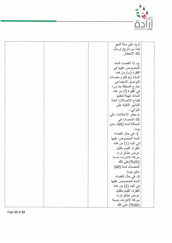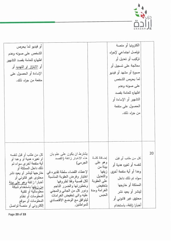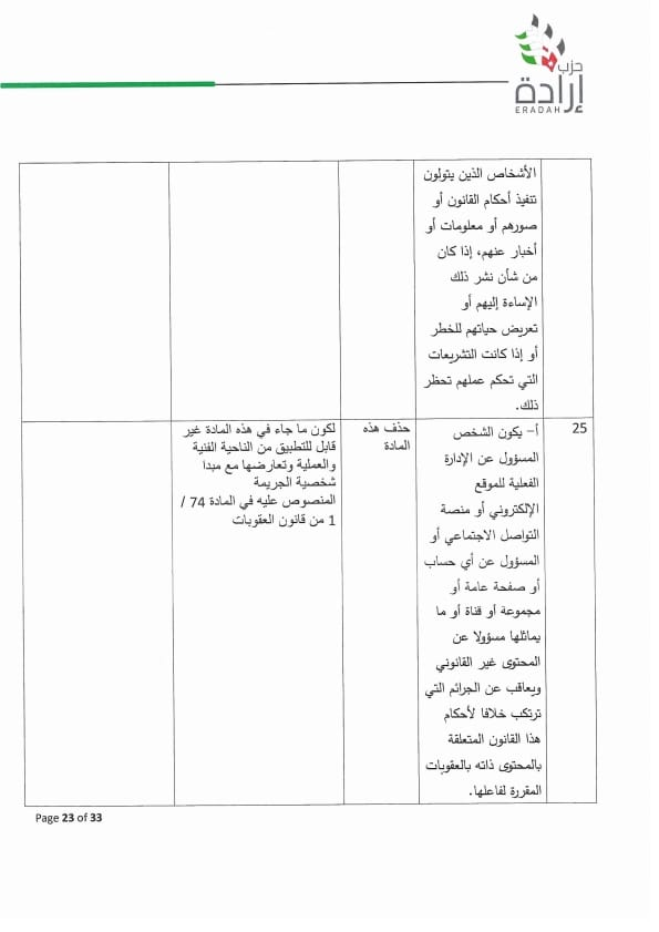 هذا ويشار إلى أن موقف إرادة لم يكن عموميات وشعارات وإنما تفاصيل دقيقة حيث تضمن موقف الحزب حذف المواد التالية مع مبررات وافية تتعلق بمخالفة تشريعات أخرى او عبارات فضفاضة او تعارض بين التعريفات واستخداماتها في المشروع وما إلى ذلك: ٤/هـ ، ١٠، ١٥، ١٦، ١٧، ١٨ ، ٢٣ ، ٢٥ ، ٢٧ ، ٢٨/ج ، ٣٣ ، ٣٧. ، كما تضمن الموقف تعديلات على المواد من ١ إلى ٩ ، والمواد ١١، ١٢