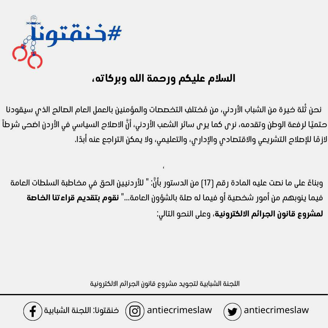 لذا ومن هذا المُنطلق وإيمانًا منا بضرورة حماية مسيرة الإصلاح السياسي التي خطّها الأردن مع بدء المئوية الثانية، فإننا كلجنة شبابية تمثل جميع أطياف المجتمع الأردني بمختلف توجهاته وتياراته، نعلن رفضنا الكامل لمشروع القانون المقترح بصيغته الحالية، ونطالب بضرورة القيام بمراجعة كاملة لمواد هذا المقترح بصفة تشاركية مع ممثلي المجتمع الأردني وبما يضمن صيانة حريات الأردنيين وحفظ حقوقهم جميعاً بدون تمييز، وإذ نؤكد قيامنا بتحضير مراجعة كاملة لمواد مشروع القانون وأننا بصدد بتقديمها للجهات ذات العلاقة ومشاركتها مع الرأي العام في أقرب فرصة.