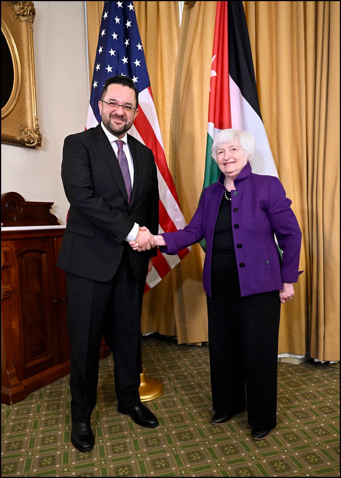 “انه من دواعي سروري ان أرحب بوزير المالية العسعس ووزيرة التخطيط والتعاون الدولي طوقان ومحافظ البنك المركزي شركس والسفيرة قعوار هنا في الخزانة الامريكية.