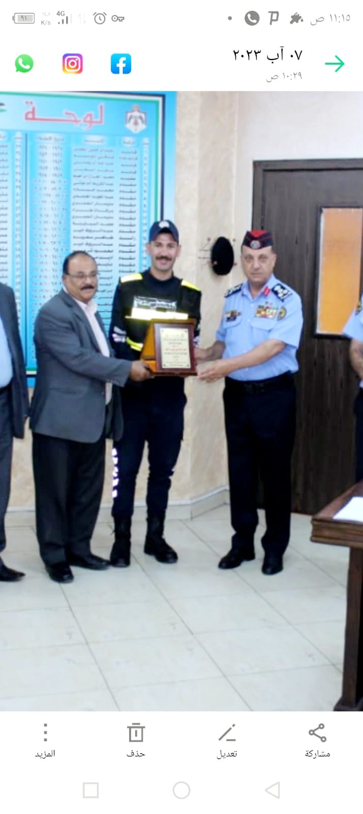 نشكر مدير شرطة البلقاء على تكريم الرقيب بسام بني عيسى، فهو تقدير مستحق لجهوده وتضحياته. إن هذا التكريم يعكس تقدير المؤسسة للعمل الجاد والتفاني الذي يقدمه الرقيب بني عيسى في سبيل حماية الأرواح والممتلكات والحفاظ على الأمن والسلامة.