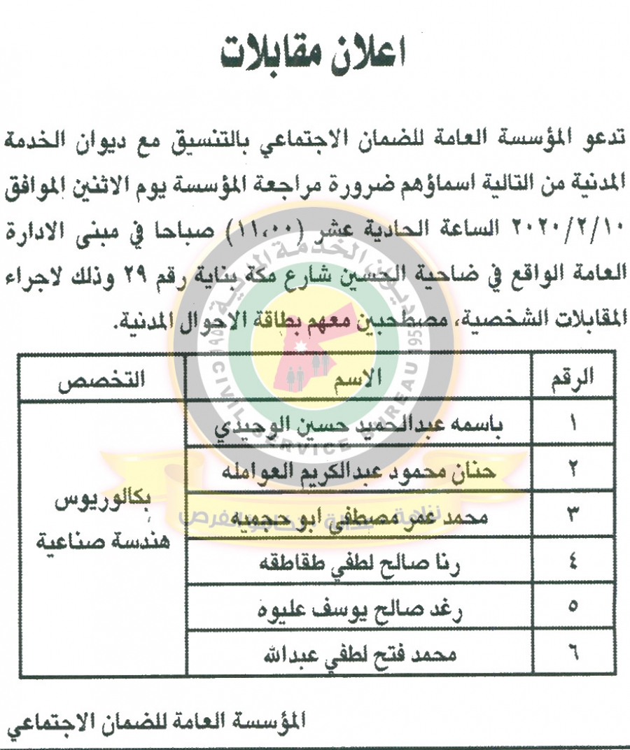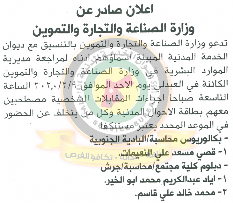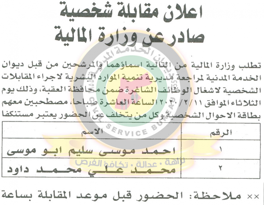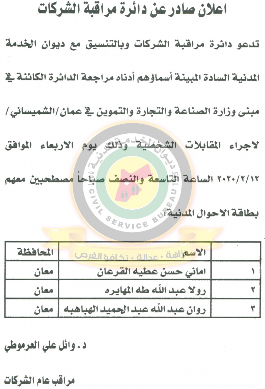 دعا ديوان الخدمة المدنية بالتعاون مع مختلف الوزارات والمؤسسات الحكومية، التالية اسماؤهم لاجراء المقابلات الشخصية وعقد الامتحان التنافسي لغايات التعيين.