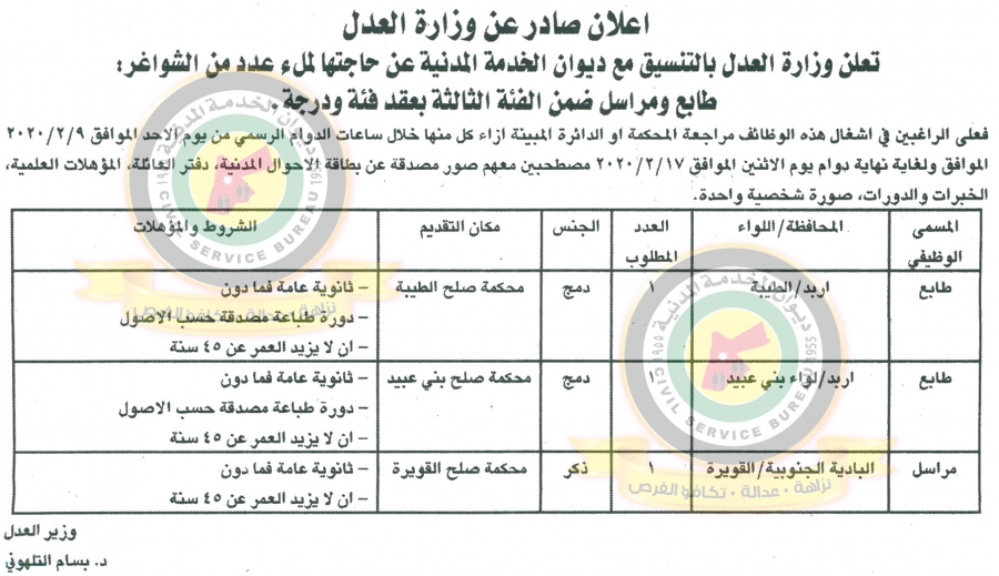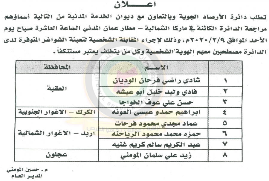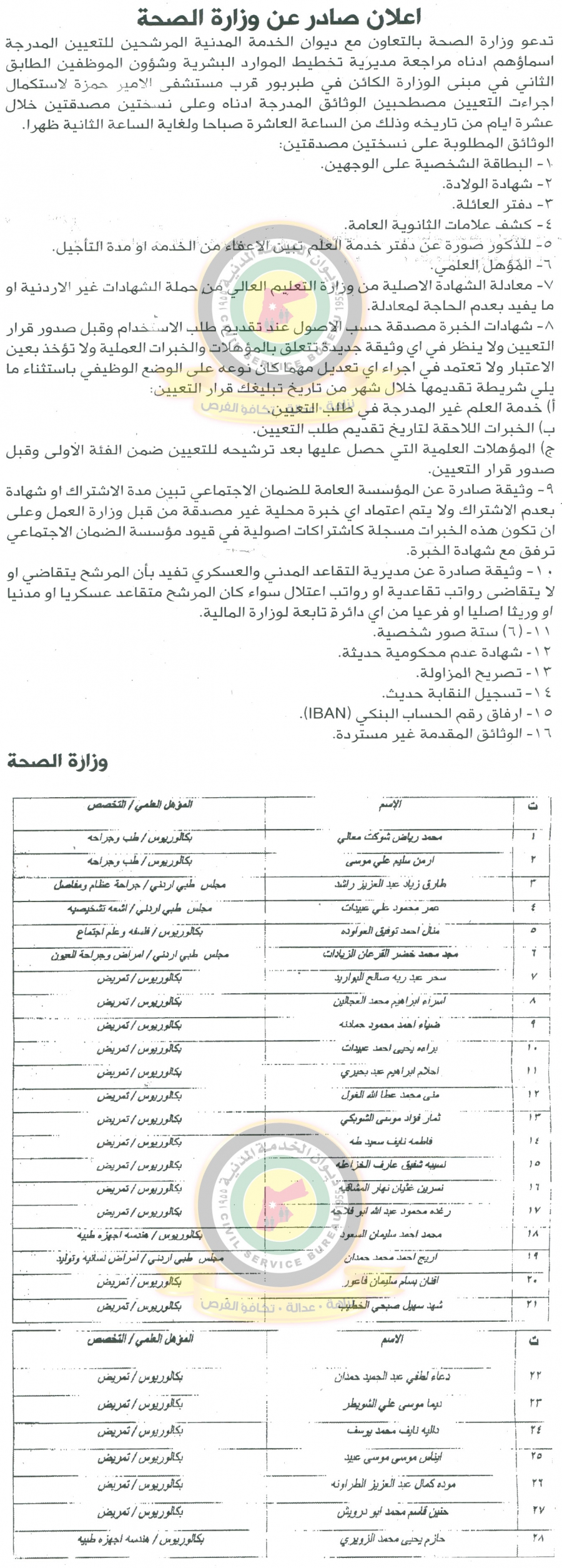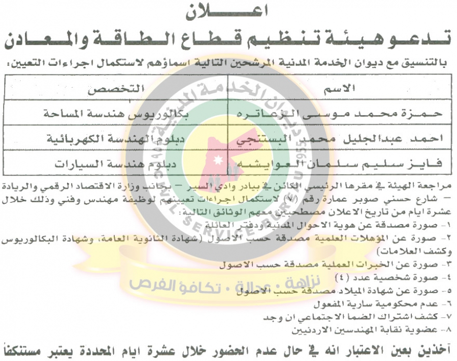 دعا ديوان الخدمة المدنية بالتعاون مع مختلف الوزارات والمؤسسات الحكومية، التالية اسماؤهم لاجراء المقابلات الشخصية وعقد الامتحان التنافسي لغايات التعيين.