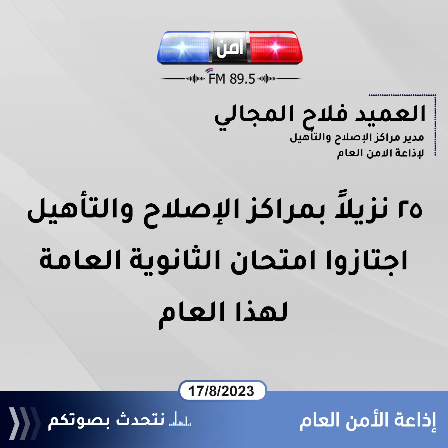 وأضاف العميد المجالي خلال حديثه عبر إذاعة الأمن العام إن إدارة مراكز الإصلاح والتأهيل وفرت كافة الظروف والبيئة المناسبة لتمكين النزلاء من التقدم للامتحانات كجزء من إصلاحهم وتأهيلهم