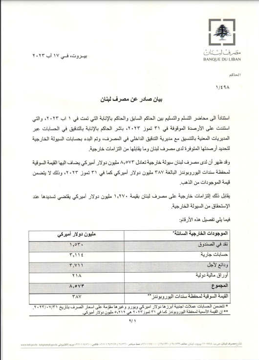 أعلن حاكم مصرف لبنان بالإنابة وسيم منصوري، أن هناك التزامات خارجية على البنك المركزي اللبناني بقيمة 1.27 مليون دولار يجب سدادها عند الاستحقاق من السيولة.وقال منصوري، في بيان اليوم، الخميس، إن هناك التزامات خارجية على مصرف لبنان بقيمة 1.27 مليون دولار يجب سدادها فور الحصول على السيولة اللازمة.وأضاف منصوري في بيانه، أن لبنان لديها سيولة خارجية تعادل 8.573 مليون دولار أمريكي، ويضاف إلى السيولة القيمة السوقية لمحفظة سندات اليورو بوندز البالغة 387 مليون دولار من دون قيمة موجودات.