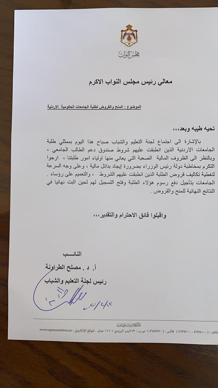 وجاء ذلك على خلفية اجتماع عقد اليوم مع عدد من ممثلي الطلبة بالجامعات الاردنية مع لجنة التعليم والشباب بمجلس النواب .