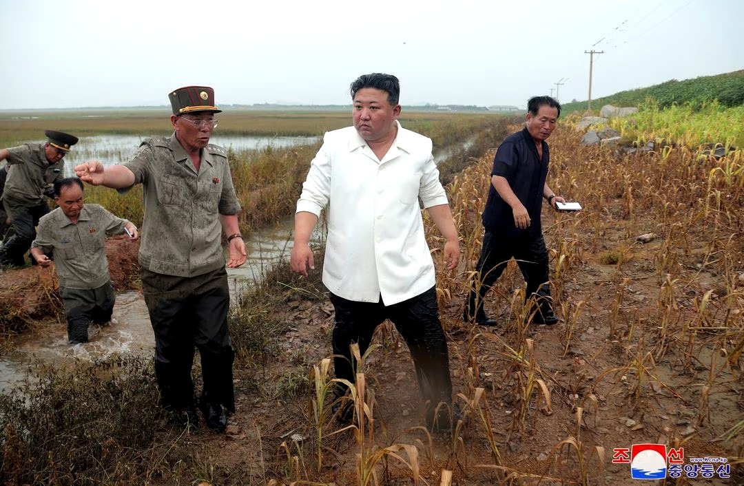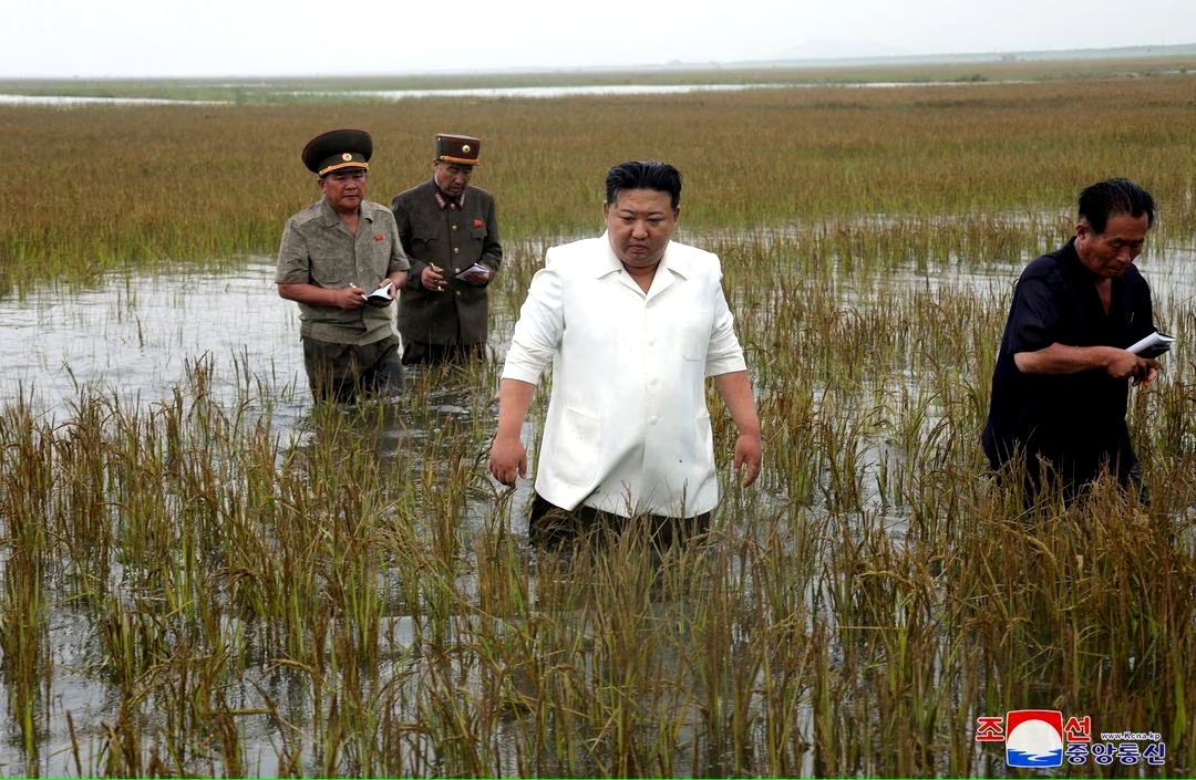 وأظهرت الصور التي بثتها وسائل الإعلام الرسمية، كيم في حقل أرز غمرته مياه الفيضانات في منطقة نامفو، وهو يعطي تعليمات لمسؤولين متجهمي الوجوه، فيما كان أحدهم يدوّن الملاحظات.