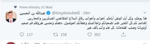 وقال جلالته في يوم الوفاء للمتقاعديين العسكريين والذي يصادف اليوم السبت عبر تويتر : هذا يومكم، وكل أيام الوطن أيامكم.