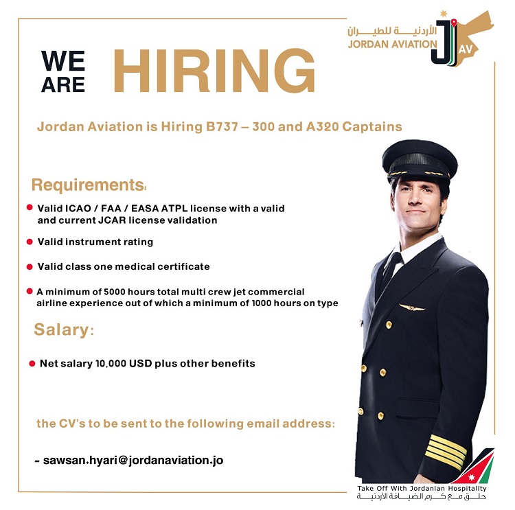 أعلنت الأردنية للطيران عن توفر شواغر لقائد طائرة لأنواع الطائرات التالية : 300-A 320 + Boeing 737 على الراغبين بالعمل ضمن الشروط المعدة التقدم بطلباتهم من خلال الأيميل التالي : sawsan.hyari@jordanaviation.jo https://nayrouz.com/article/390699