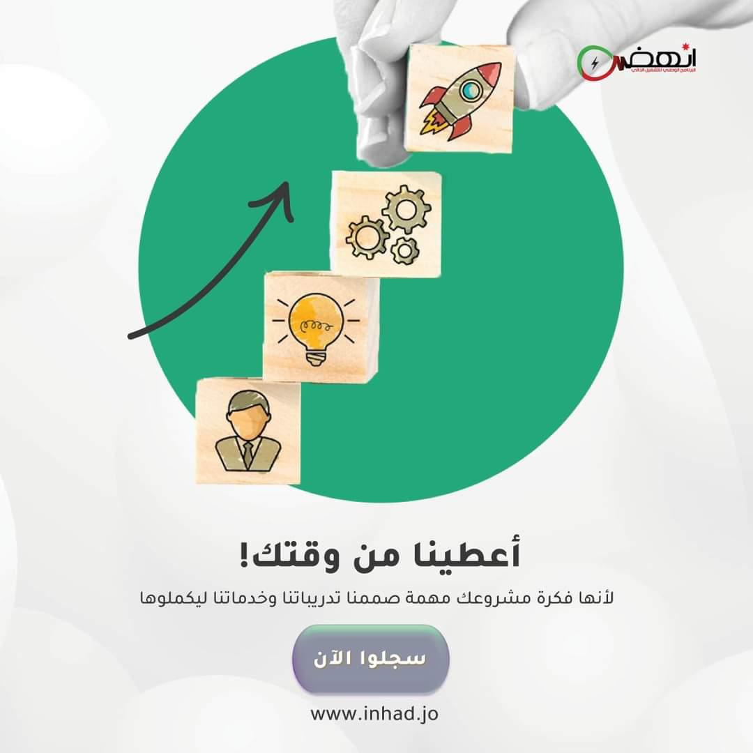 جلسات إرشاد وتوجيه من قبل خبراء ومختصين في عدة مجالات ?التشبيك مع المنظومة الاقتصادية والمزيد♾️?انضموا الآن على الرابط: https://register.inhad.jo/