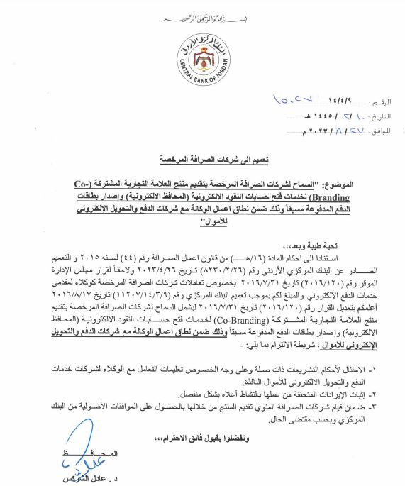 أتاح البنك المركزي الأردني، لشركات الصرافة المرخصة في السوق المحلي، بتقديم منتج العلامة التجارية المشتركة لخدمات فتح حسابات النقود الالكترونية (المحافظ الالكترونية) .