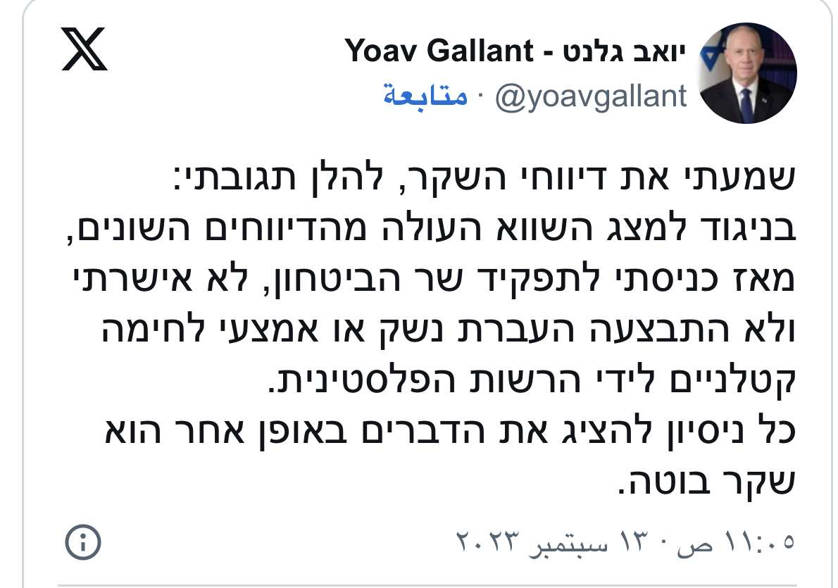 وأكد وزير الجيش الإسرائيلي "يؤاف غالانت" في تغريدة له عبر "إكس"، أنّه "خلافا للتضليل الذي تظهره التقارير، فإنني، منذ توليت منصب وزير الجيش، لم أوافق ولم أقم بنقل أسلحة إلى السلطة الفلسطينية.