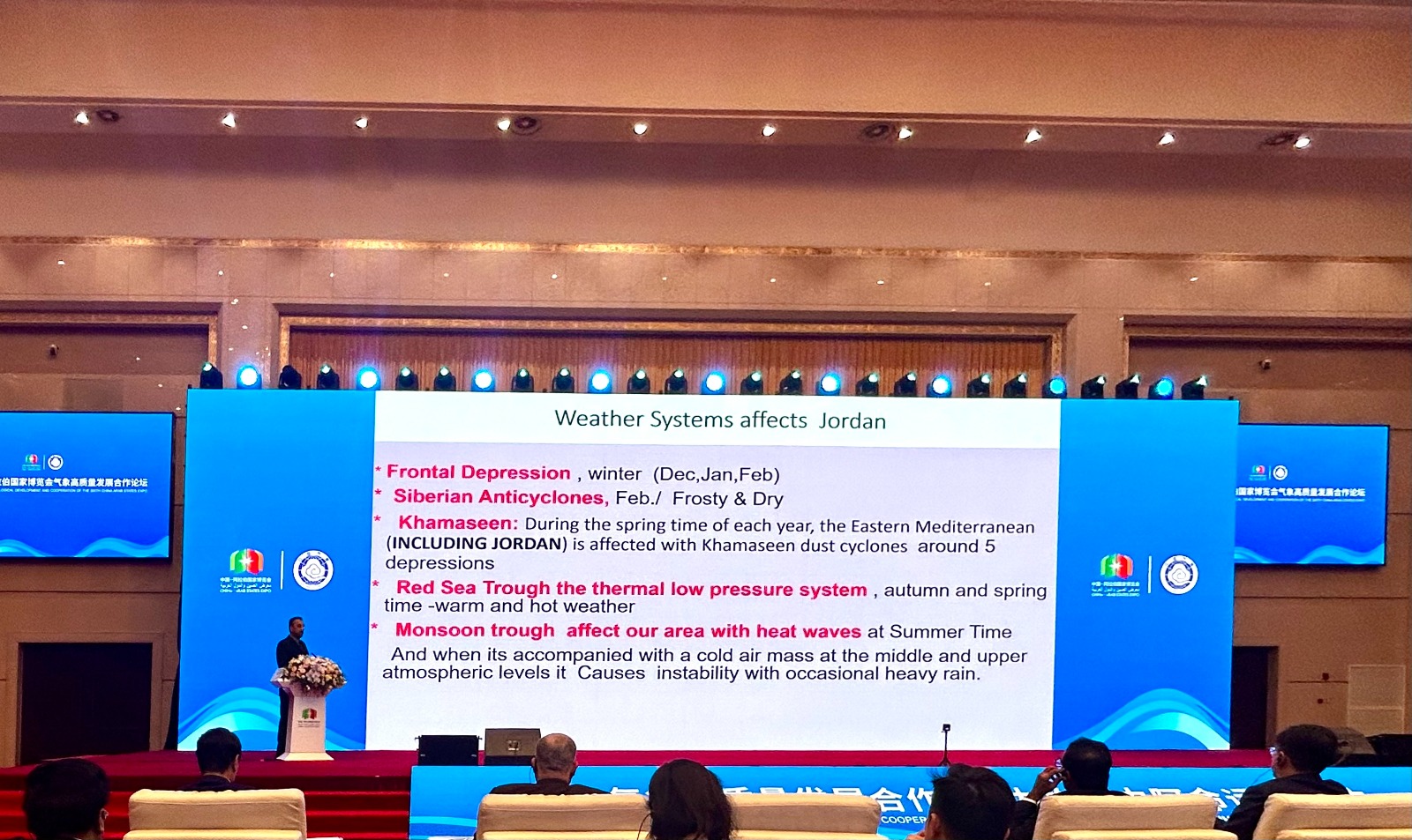 ومثل الاردن في الاجتماعات مدير إدارة الأرصاد الجوية الأردنية رائد رافد ال خطاب، الى جانب المديرين العامين للأرصاد الجوية في الدول العربية والصين بالاضافة لرئيس منظمة الأرصاد العالمية السيد عبد الله المندوس.