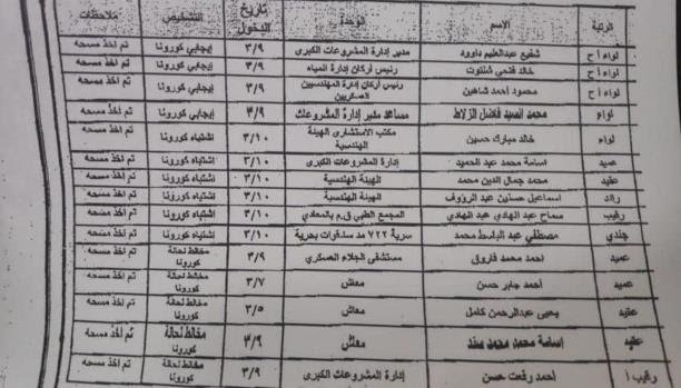 وحسب المصدر، شملت قائمة العسكريين المصريين الذين ثبتت إيجابية عيناتهم معملياً لفيروس كورونا، كلاً من: "مدير إدارة المشروعات الكبرى في الهيئة الهندسية للجيش، اللواء أركان حرب شفيع عبد العليم داوود، ورئيس أركان إدارة المهندسين العسكريين، اللواء أركان حرب محمود أحمد شاهين، ومساعد مدير إدارة المشروعات في الهيئة الهندسية، محمد السيد فاضل الزلاط، فضلاً عن 11 آخرين من كبار العسكريين المشتبه في إصابتهم، من المخالطين للحالات الإيجابية".