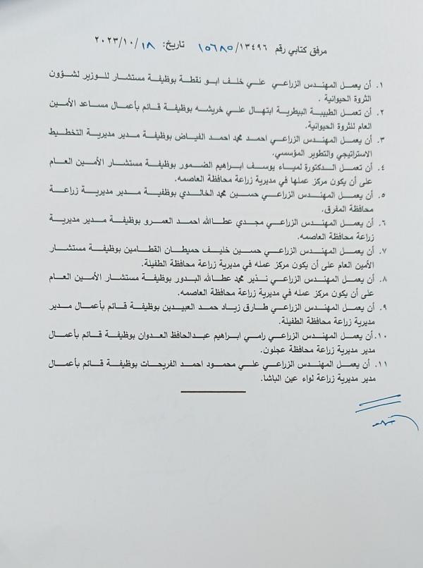 قرر وزير الزراعة الدكتور خالد الحنيفات إجراء تشكيلات جديدة في الوزارة.