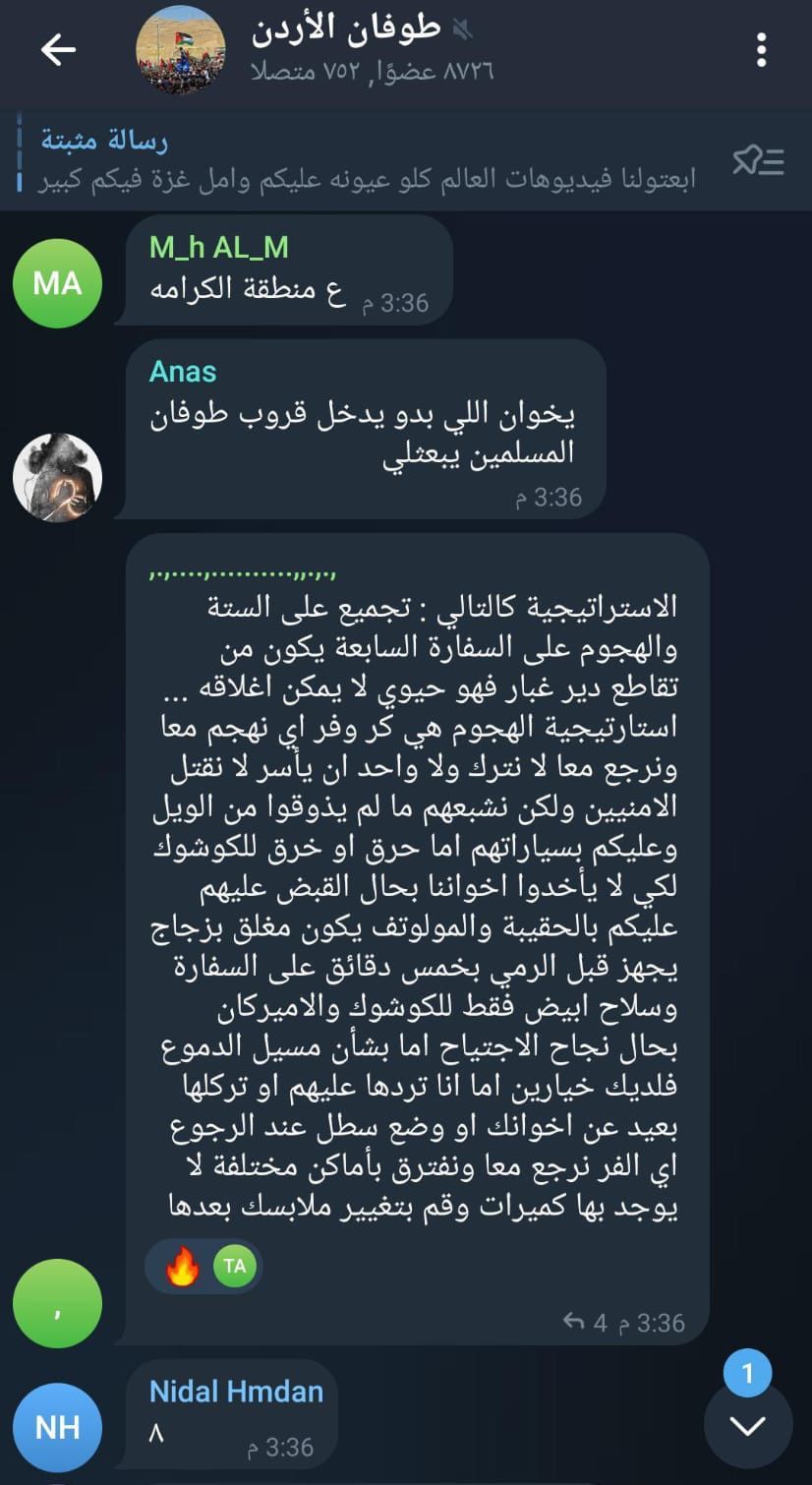 نحن اليوم نمر باخطر مرحلة منذ عام ١٩٤٨ والتصدي لهذه المخططات لا يكون بالحرق والعبث بالممتلكات العامة والخاصة وتحويل الصراع بيننا وبين تل ابيب إلى صراع شعبي امني ، بل يكون بدعم قرار الملك وتبني خطاب الدولة والتكاتف جميعا لنخرج باقل الخسائر .