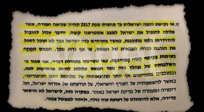 وأفادت الوثيقة بأن الهدف الرئيسي هو "تدمير إسرائيل بحلول عام 2022 وتحرير جميع الأراضي الفلسطينية". أن "ليبرمان كان قلقا من تعزيز المنظمة الإرهابية التي تسيطر على غزة. لكن لم يأخذ أي من الأطراف التي عرض عليه التحذير، بما في ذلك نتنياهو ورئيس الأركان السابق غادي آيزنكوت، هذا السيناريو بالجدية التي يستحقها".