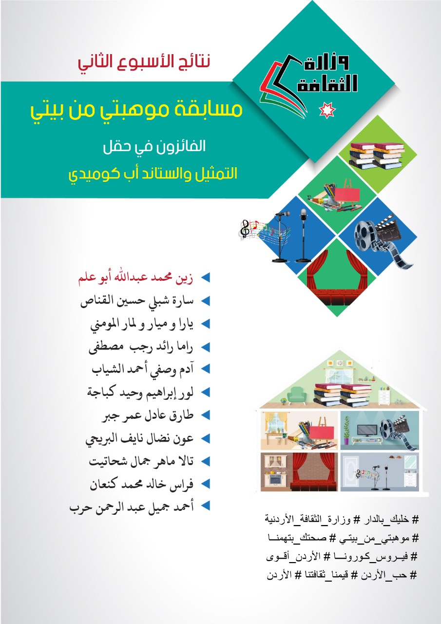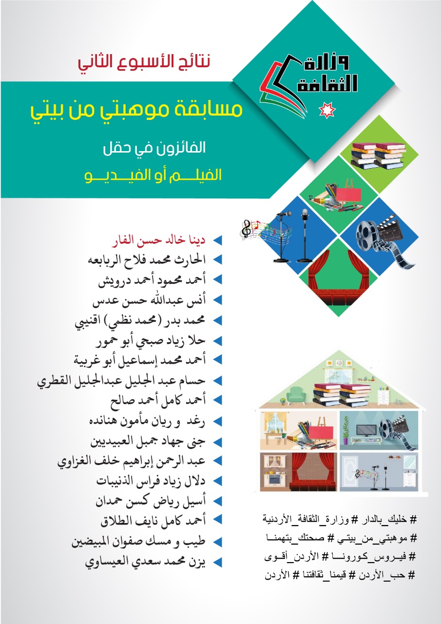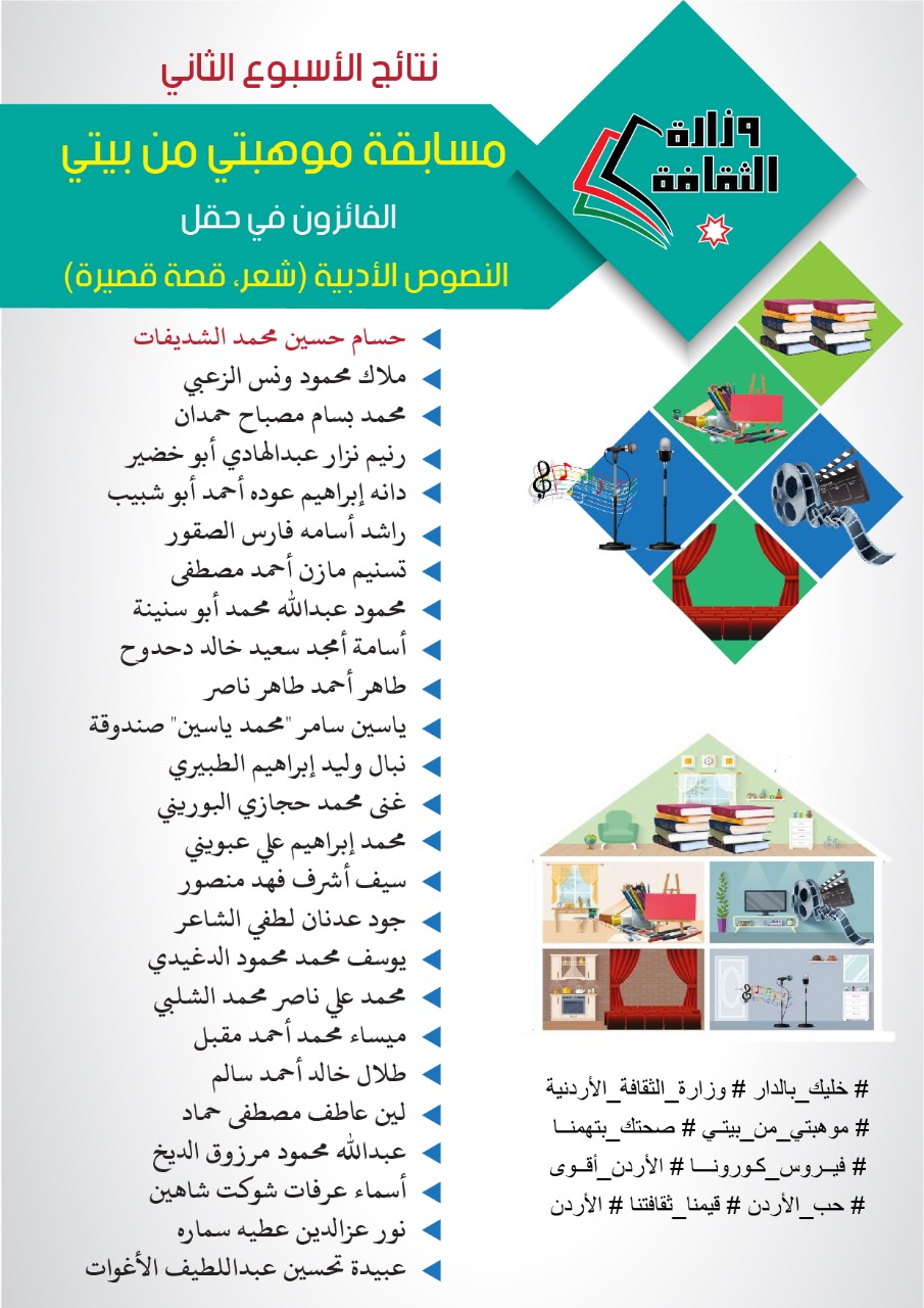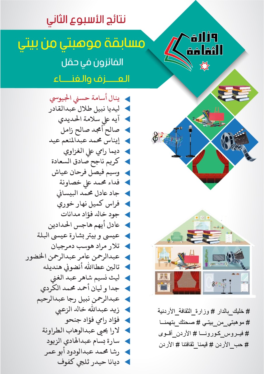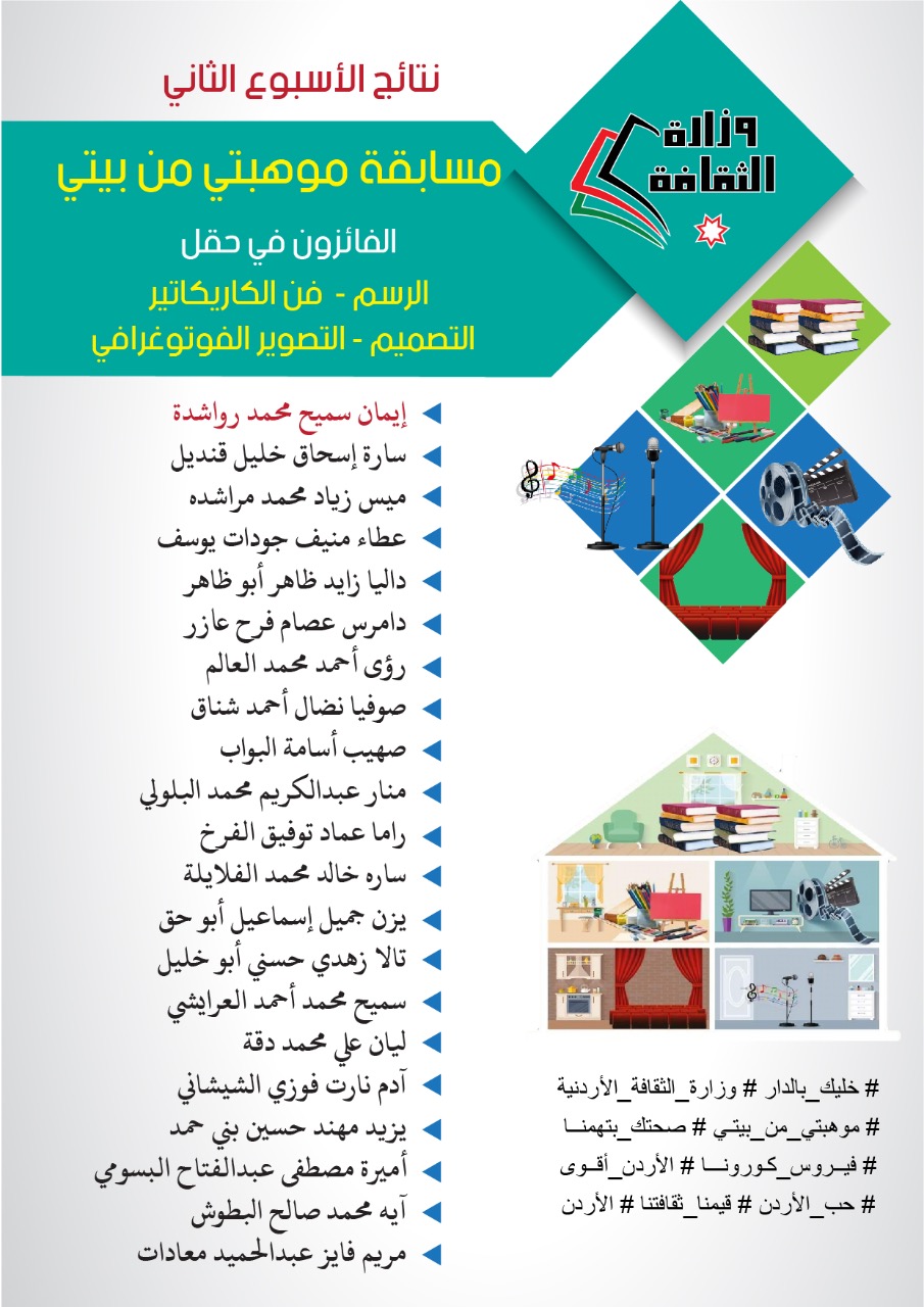 أعلنت وزارة الثقافة أسماء الفائزين في مسابقة "موهبتي من بيتي"للأسبوع الثاني التي أطلقتها الوزارة مؤخرا على موقعها الإلكتروني وشبكات التواصل الاجتماعي. وسط اقبال واسع على المشاركة والتفاعل حيث زادت اعداد المشاركات في الاسبوع الثاني نحو 95 % على اعداد المشاركات في الاسبوع الاول في مختلف حقول المسابقة ومن مختلف المحافظات .