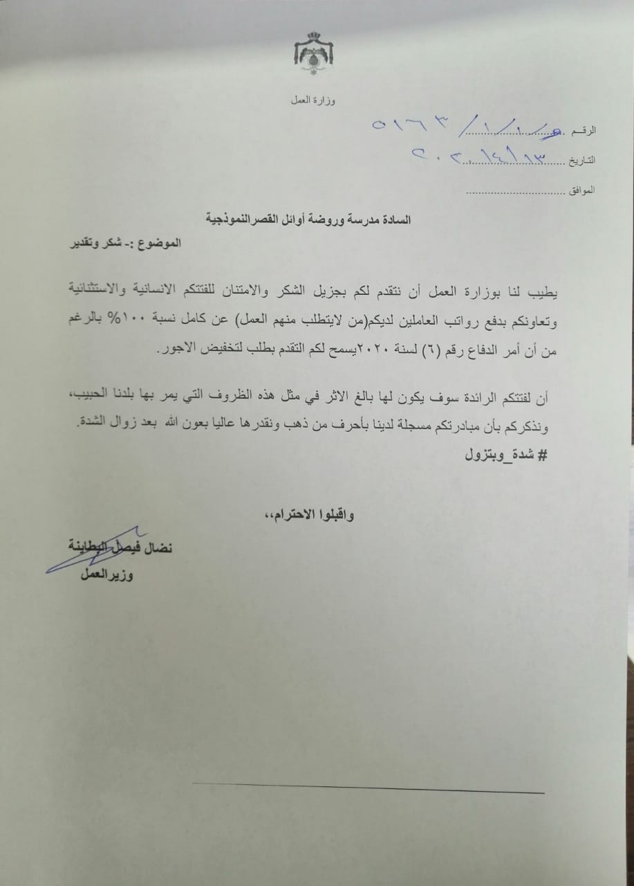 وجه معالي وزير العمل نضال البطاينة رسالة شكر وتقدير لمدرسة وروضة اوائل القصر النموذجية بمحافظة الكرك بعد القرار الذي اتخذته الادارة بِها بدفع كامل رواتب اعضاء الهيئة التدريسية والموظفين دون خصومات ، حيث وصف البطاينة باْن هذه المبادرة تسجل بأحرف من ذهب ومقدرة عاليا وتستحق الاحترام وتمثل اعلى مراتب الوطنية والانسانية بدورهم قالوا مالكي المدرسة الدكتور هادي المحاسنة الحمايدة والعقيد المتقاعد ابراهيم الشبيلات :- تمشيا مع توجيهات جلالة قائد البلاد بالوقوف بجانب العاملين بالقطاع الخاص وتقديرا لجهد معلمي وموظفي المدارس الخاصة وهم الذراع الرئيسي للنهوض بالعملية التربوية في الاردن قرررنا منحهم كامل رواتبهم دعما لهم بهذه الظروف الاستثنائية التي يمر بها الوطن .
