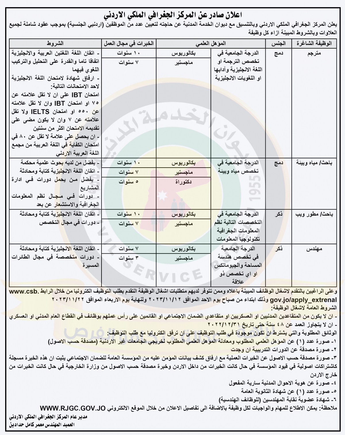 أعلن المركز الجغرافي الملكي الاردني وبالتنسيق مع ديوان الخدمة المدنية عن حاجته لتعيين عدد من الموظفين الأردنيين . وتاليًا التفاصيل في الاعلان المرفق :