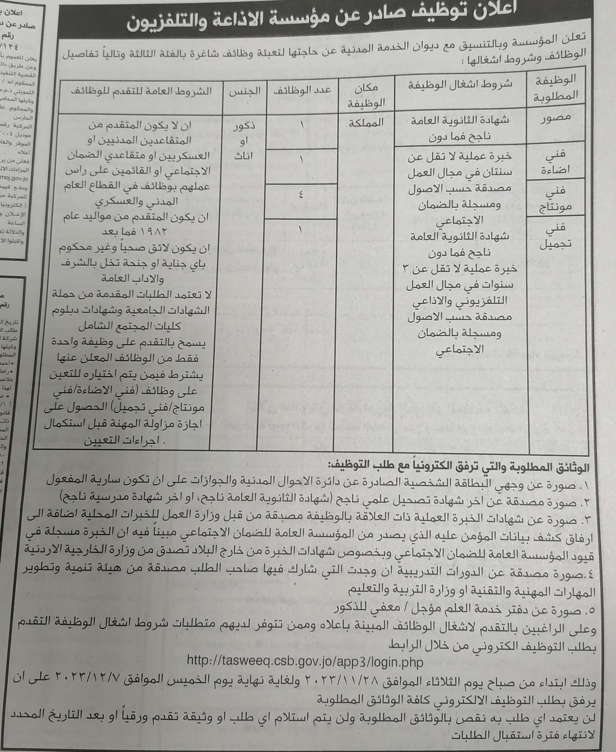 وظائف في مؤسسة الإذاعة والتلفزيون - تفاصيل