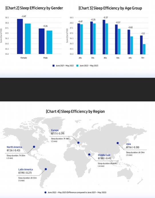 ولم يكن هذا النمط محصوراً بأي مجموعة سكانية أو منطقة محددة، بل تم الإبلاغ عن انخفاض في مدة النوم وكفاءته لدى الجنسين وكافة الفئات العمرية والمناطق التي تمت دراستها: • رغم استمرار انخفاض كفاءة النوم بالنسبة للذكور، فقد شهدت الإناث الانخفاض الأكثر وضوحاً خلال العام الماضي. (الرسم البياني 2) • أظهرت الشريحة السكانية الأكبر سناً انخفاضاً أكبر في كفاءة النوم. ويعاني الأفراد الذين تزيد أعمارهم على 70 عاماً انخفاضاً بمعدل الضعف مقارنة مع المعطيات الخاصة بالأشخاص في العشرينات من العمر. (الرسم البياني 3) •