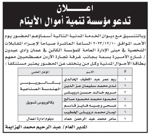 دعت مؤسسة تنمية أموال الأيتام وبالتنسيق مع ديوان الخدمة المدنية مرشحين للتعيين لإجراء مقابلات شخصية . وتاليًا التفاصيل في الاعلان المرفق :