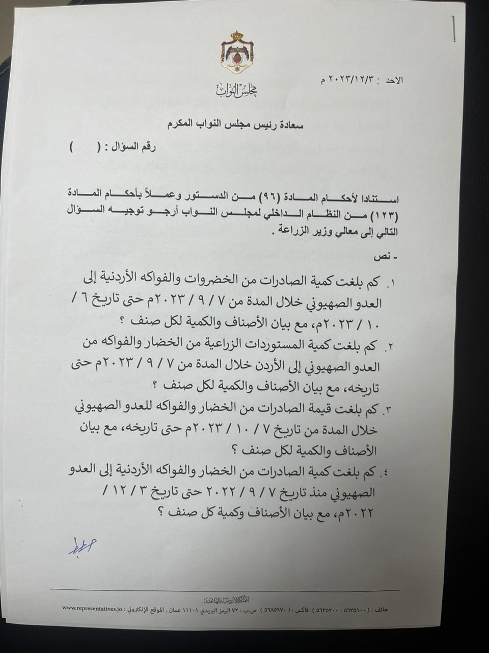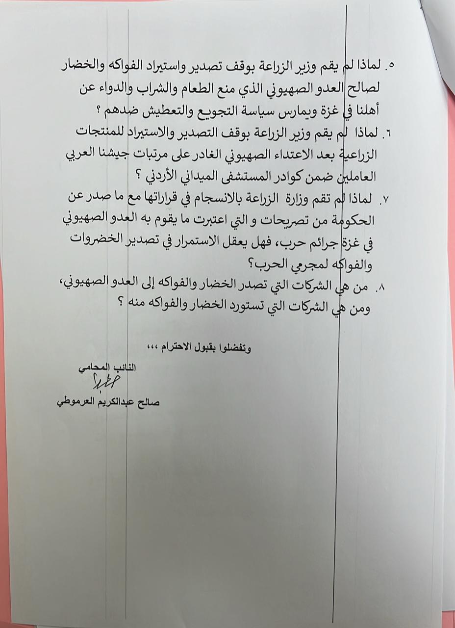 سعادة رئيس مجلس النواب المكرمرقم السؤال : ( )استنادا لأحكام المادة (96) من الدستور وعملاً بأحكام المادة (123) من النظام الداخلي لمجلس النواب أرجو توجيه السؤال التالي إلى معالي وزير الزراعة .نص السؤال : 1. كم بلغت كمية الصادرات من الخضروات والفواكه الأردنية إلى العدو الصهيوني خلال المدة من ٧ / ٩ / ٢٠٢٣م حتى تاريخ ٦ / ١٠ / ٢٠٢٣م، مع بيان الأصناف والكمية لكل صنف ؟ 2. كم بلغت كمية المستوردات الزراعية من الخضار والفواكه من العدو الصهيوني إلى الأردن خلال المدة من ٧ / ٩ / ٢٠٢٣م حتى تاريخه، مع بيان الأصناف والكمية لكل صنف ؟3. كم بلغت قيمة الصادرات من الخضار والفواكه للعدو الصهيوني خلال المدة من تاريخ ٧ / ١٠ / ٢٠٢٣م حتى تاريخه، مع بيان الأصناف والكمية لكل صنف ؟ 4. كم بلغت كمية الصادرات من الخضار والفواكه الأردنية إلى العدو الصهيوني منذ تاريخ ٧ / ٩ / ٢٠٢٢ حتى تاريخ ٣ / ١٢ / ٢٠٢٢م، مع بيان الأصناف وكمية كل صنف ؟5. لماذا لم يقم وزير الزراعة بوقف تصدير واستيراد الفواكه والخضار لصالح العدو الصهيوني الذي منع الطعام والشراب والدواء عن أهلنا في غزة ويمارس سياسة التجويع والتعطيش ضدهم ؟ 6. لماذا لم يقم وزير الزراعة بوقف التصدير والاستيراد للمنتجات الزراعية بعد الاعتداء الصهيوني الغادر على مرتبات جيشنا العربي العاملين ضمن كوادر المستشفى الميداني الأردني ؟ 7. لماذا لم تقم وزارة الزراعة بالانسجام في قراراتها مع ما صدر عن الحكومة من تصريحات و التي اعتبرت ما يقوم به العدو الصهيوني في غزة جرائم حرب، فهل يعقل الاستمرار في تصدير الخضروات والفواكه لمجرمي الحرب؟ 8. من هي الشركات التي تصدر الخضار والفواكه إلى العدو الصهيوني، ومن هي الشركات التي تستورد الخضار والفواكه منه ؟ وتفضلوا بقبول الاحترام ،،، النائب المحامي صالح عبدالكريم العرموطي
