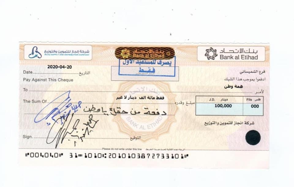 أيماناً منا بتأدية هذا الواجب فقد قمنا بتقديم دفعه من حق الاردن في أعناقنا والمساهمة بمبلغ ١٠٠،٠٠٠ مائة الف دينار لصندوق همة وطن و١٠،٠٠٠عشرة آلاف دينار لكل من وزارة التنمية الأجتماعة و و١٠،٠٠٠عشرة آلاف دينار لوزارة الصحة .