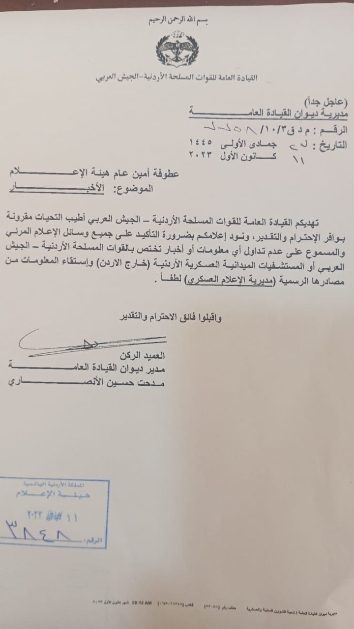 بالوثيقة .. هيئة الإعلام الأردنية تعمم عدم تداول أي معلومة أو أخبار تختص بالجيش