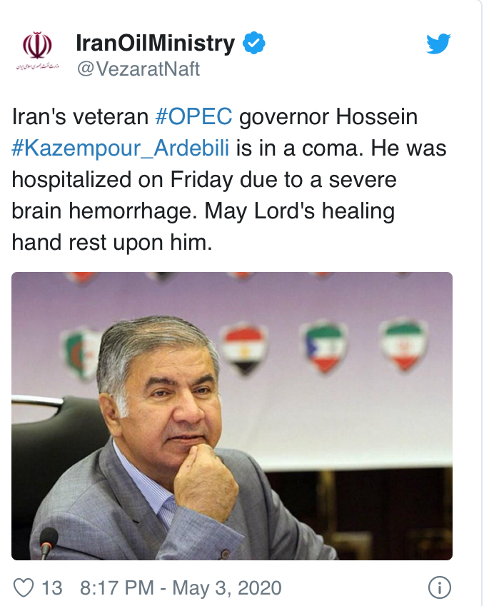 أعلنت وزارة النفط الإيرانية أن المندوب الإيراني لدى منظمة الدول المصدرة للنفط (أوبك) حسين كاظم بور أردبيلي دخل في غيبوبة إثر إصابته بنزيف دماغي.
