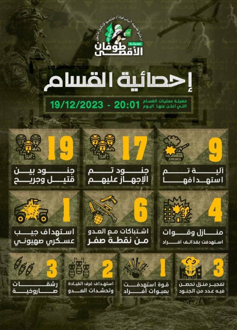 اعلنت كتائب عز الدين القسام ، عن إحصائية عملياتها التي أعلن عنها اليوم حتى الساعة 20:01 بتوقيت فلسطين المحتلة : وتالياً الاحصائية :