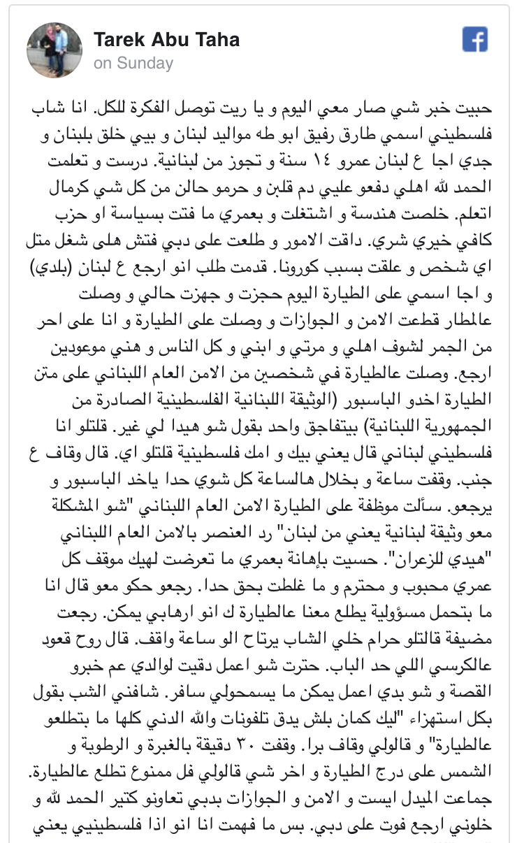 يروي الشاب الفلسطيني طارق أبو طه تفاصيل موقف تعرض له في مطار دبي، بعدما منع من صعود الطائرة المتجهة من دبي إلى مطار رفيق الحريري الدولي في بيروت.