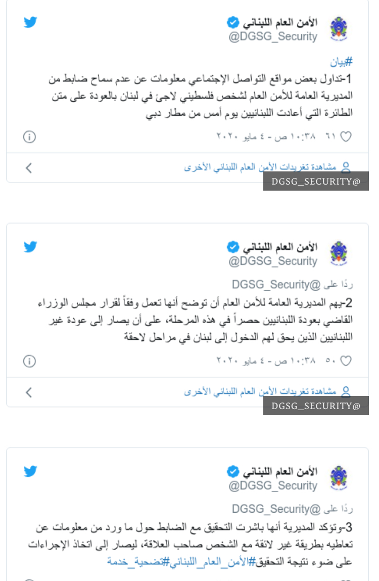 وبعد الضجة التي أحدثتها قصة أبو طه، نشرت المديرية العامة للأمن العام سلسة تغريدات عبر حسابها الرسمي قالت فيها: "تداولت بعض مواقع التواصل الاجتماعي معلومات عن عدم سماح ضابط من المديرية العامة للأمن العام لشخص فلسطيني لاجئ في لبنان بالعودة على متن الطائرة التي أعادت اللبنانيين يوم أمس من مطار دبي".