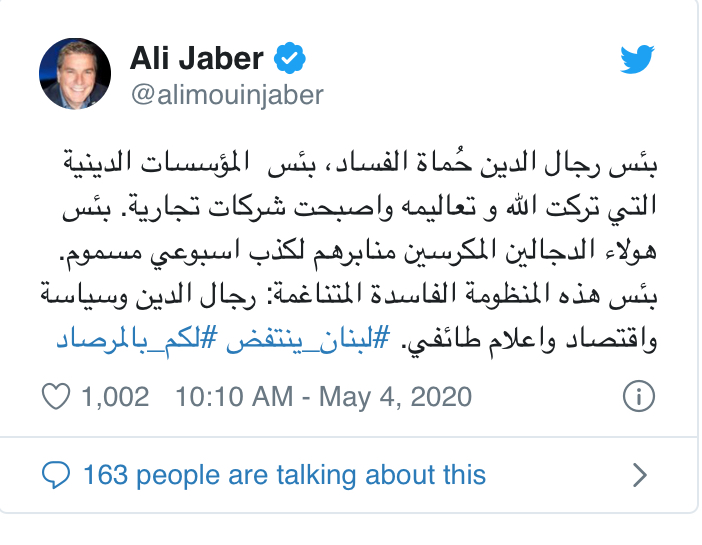 العميد علي جابر شنّ هجوماً عنيفاً على رجال الدين في لبنان واصفاً ايّاهم بأنهم ” حماة الفساد ” وقال ” بئس رجال الدين حُماة الفساد، بئس المؤسسات الدينية التي تركت الله وتعاليمه واصبحت شركات تجارية. بئس هؤلاء الدجالين المكرسين منابرهم لكذب أسبوعي مسموم. بئس هذه المنظومة الفاسدة المتناغمة: رجال الدين وسياسة واقتصاد وإعلام طائفي” .