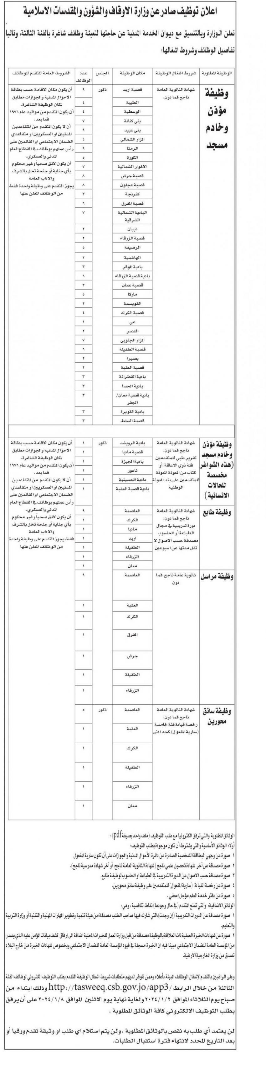 أعلنت وزارة الأوقاف والشؤون والمقدسات الإسلامية، بالتنسيق مع ديوان الخدمة المدنية عن حاجتها لتعبئة وظائف شاغرة بالفئة الثالثة. وبحسب الإعلان المنشور في الصحف اليومية، فإن الشواغر تشمل مؤذن وخادم مسجد، وطابع، ومراسل، وسائق محورين.