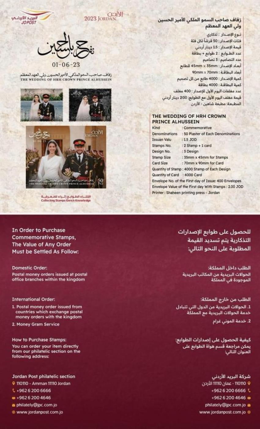 البريد الأردني يطرح طوابع تذكارية لزفاف ولي العهد