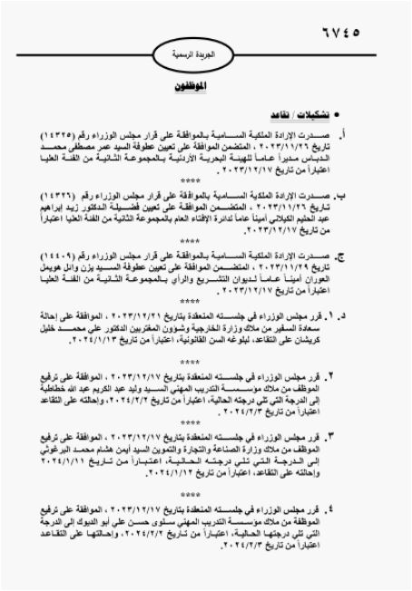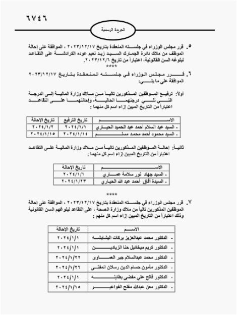 قرر مجلس الوزراء في عدد الجريدة الرسمية الصادر اليوم الأحد ، إحالة موظفين في عدد من الوزارات والدوائر إلى التقاعد. وتاليا الاسماء: