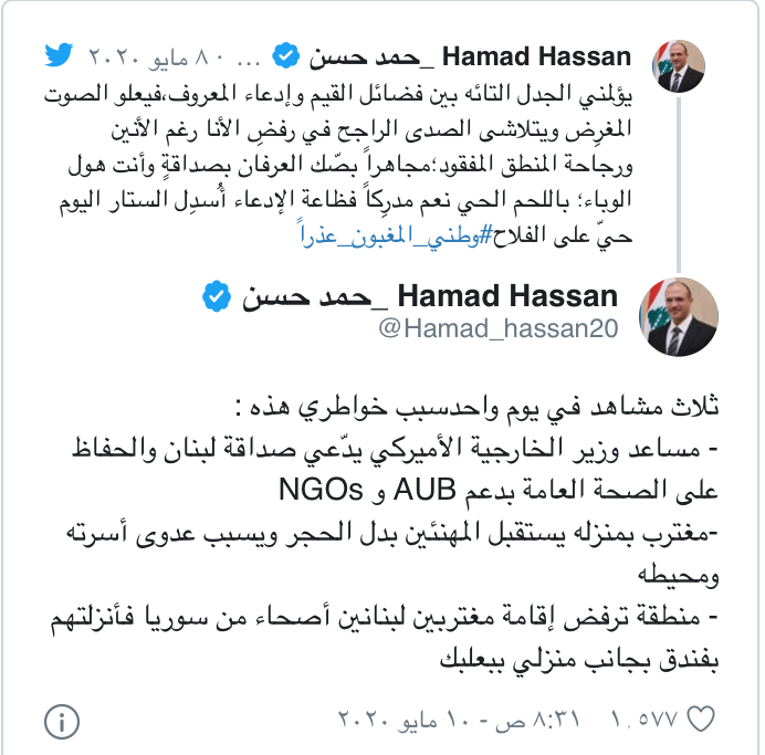 وغرد وزير الصحة العامة في لبنان، الدكتور حمد حسن على "تويتر" فجر اليوم الأحد قائلا: "3 مشاهد في يوم واحد سبب خواطري: