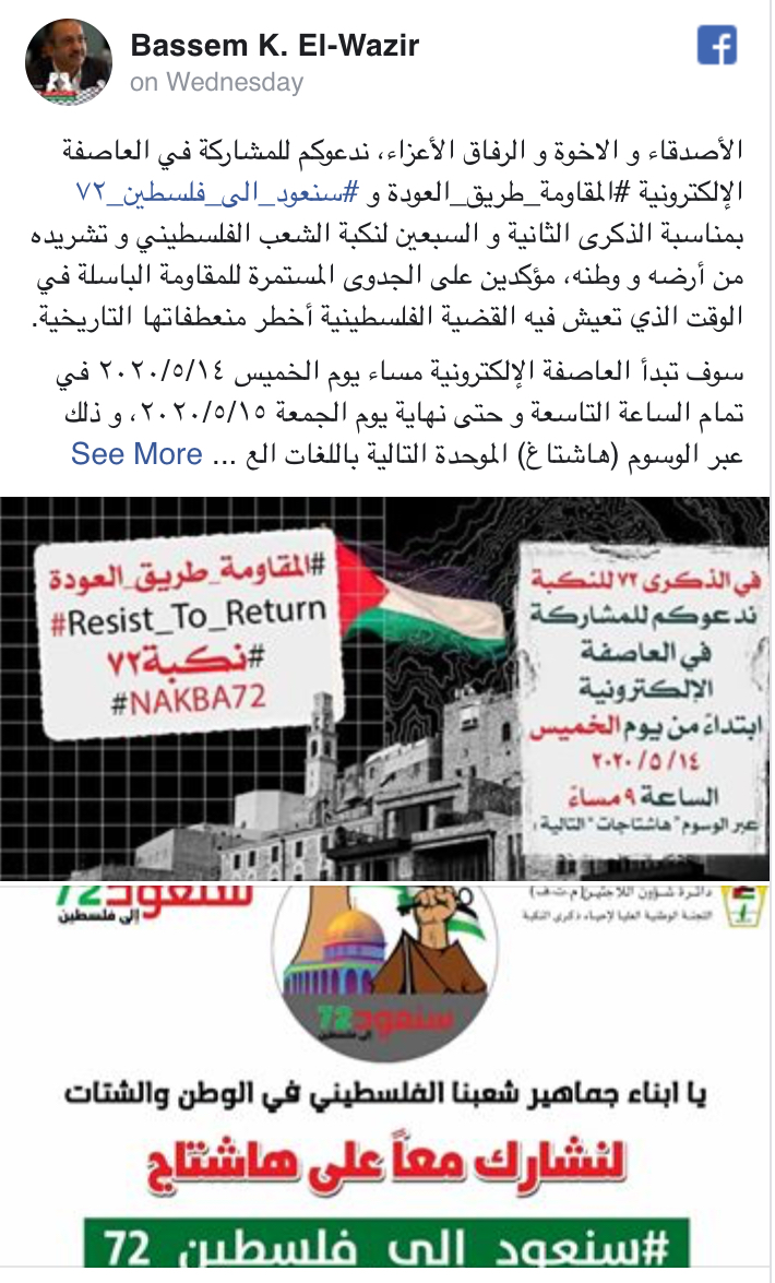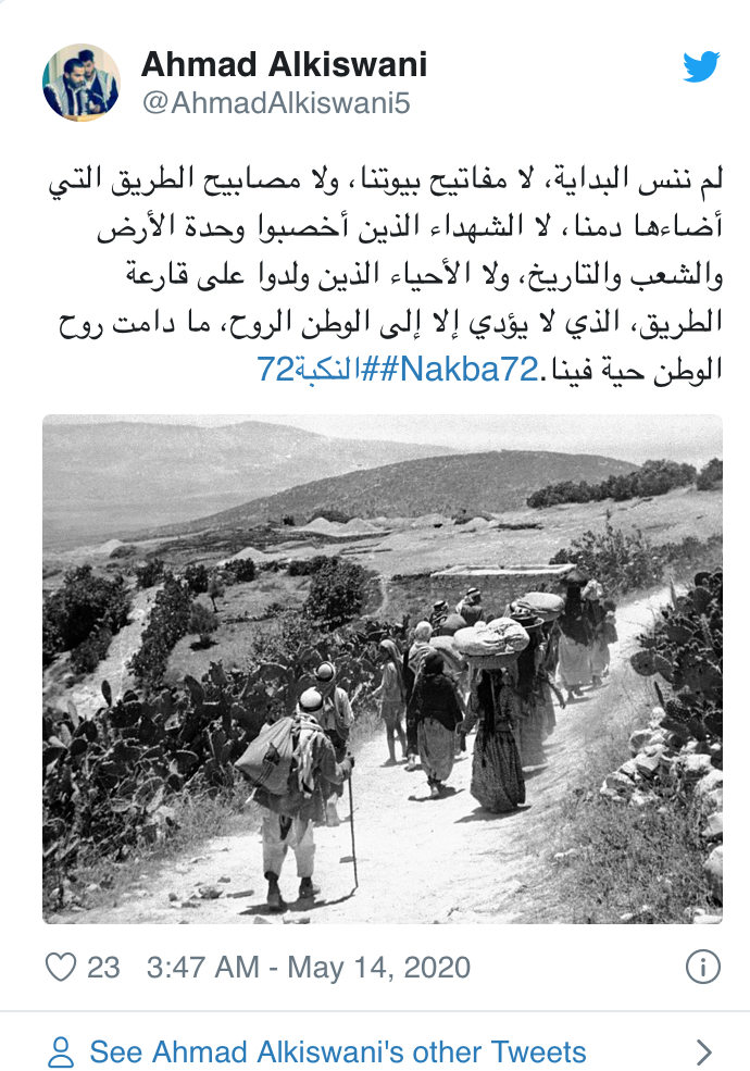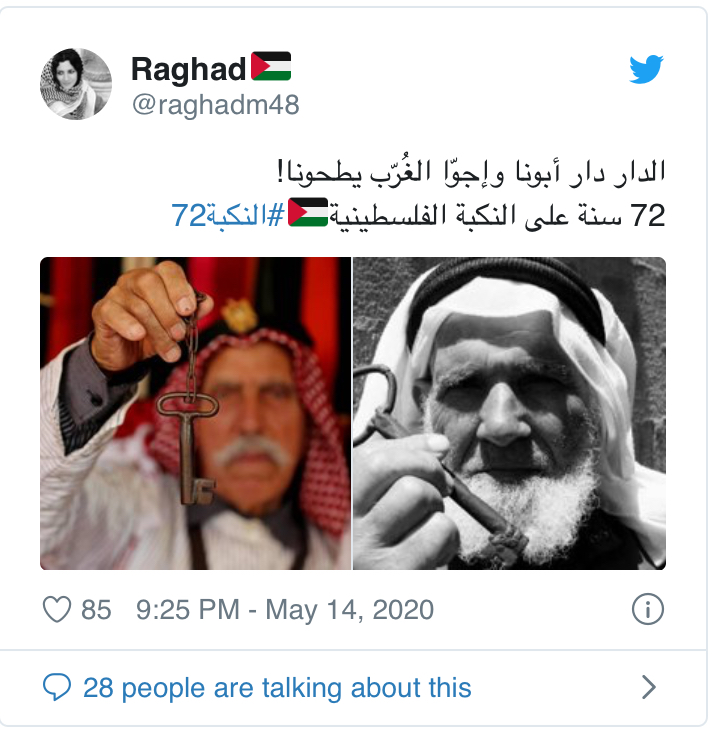 ودعا الفلسطيني بسام الوزير أبناء الشعب الفلسطيني في الوطن والشتات للمشاركة في "العاصفة الإلكترونية #المقاومةطريقالعودة و#سنعودإلىفلسطين_٧٢ـ بمناسبة الذكرى الثانية والسبعين لنكبة الشعب الفلسطيني وتشريده من أرضه و وطنه، مؤكدين على الجدوى المستمرة للمقاومة الباسلة في الوقت الذي تعيش فيه القضية الفلسطينية أخطر المنعطفات التاريخية".ولم يغب مُفتاح البيوت القديمة عن المنشورات والتغريدات، إذ يعبر من خلاله الفلسطينيون رمزياً عن حلمهم في العودة إلى المُدن والقرى والبيوت التي هُجروا منها قسراً.وتساءلت الناشطة دانيا عمر عبر موقع "تويتر": "اثنان وسبعون عاماً مضت على النكبة الفلسطينية، هل يا تُرى نحظى من بعد نكبتنا بدولةٍ فيها نحيا ونتصل؟ فالليلُ طال بنا، لم يأتنا فجرٌ ولا يجيء لنا عيدٌ ونحتفل، #النكبة72، عاشت فلسطين حرّة أبيّة رغماً عن الجميع".وأرفق الناشط أحمد القيشاوي صورة للحظة تهجير عدد من الفلسطينيين من قًراهم، بنص مؤثر قال فيه: "لم ننس البداية، لا مفاتيح بيوتنا، ولا مصابيح الطريق التي أضاءها دمنا، لا الشهداء الذين أخصبوا وحدة الأرض والشعب والتاريخ، ولا الأحياء الذين ولدوا على قارعة الطريق، الذي لا يؤدي إلا إلى الوطن الروح، ما دامت روح الوطن حية فينا، #النكبة72، #Nakba72" ( العربي الجديد )