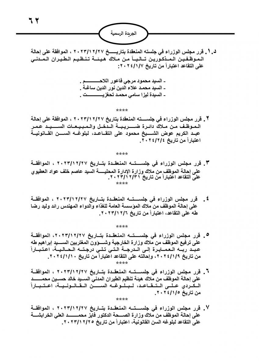 صدر في عدد الجريدة الرسمية اليوم الثلاثاء، قرارات مجلس الوزراء بإحالة عدد من موظفي الدولة إلى التقاعد، وانهاء خدمات آخرين.وتاليا الاسماء:
