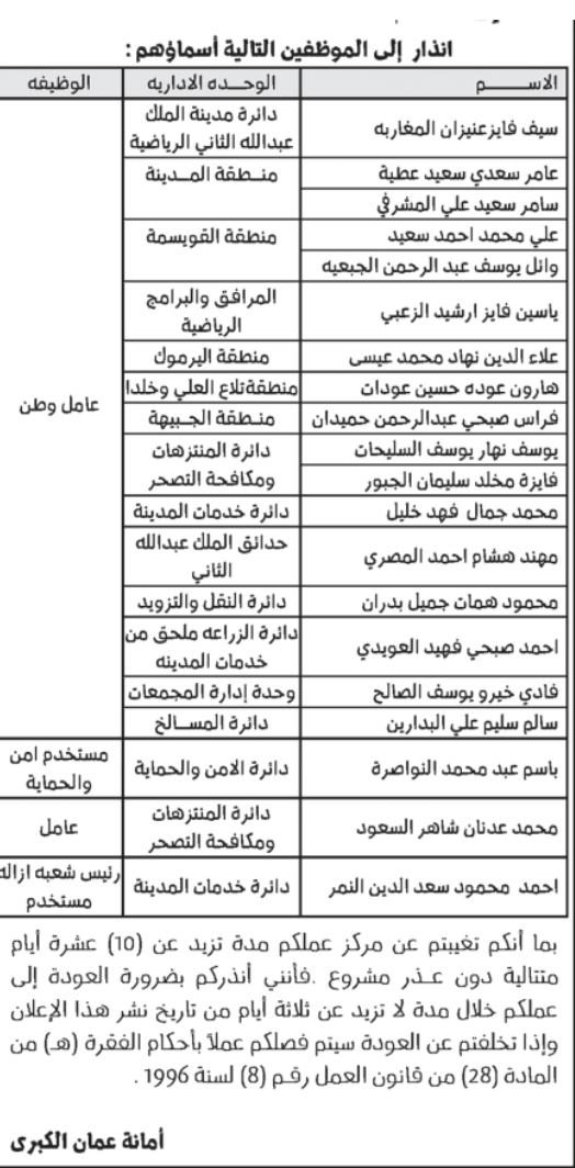 أنذرت أمانة عمّان الكبرى، 20 موظفا، بالفصل من العمل في حال تخلفهم عن العودة لعملهم.