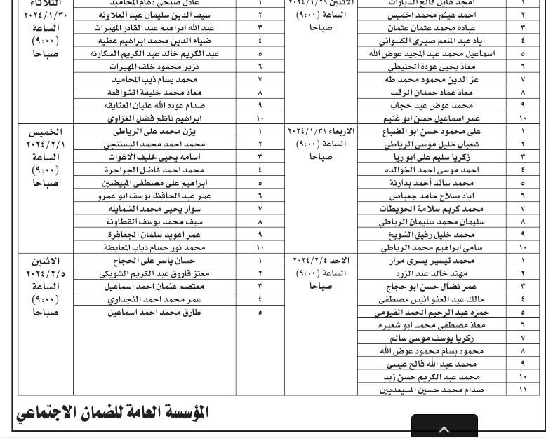 دعت المؤسسة العامة للضمان الاجتماعي التالية أسماؤهم التواجد في المكان والموعد المحدد إزاء اسم كل منهم، لغايات إجراء الفحص الفني العملي لوظيفة سائق محورين وكل من يتخلف عن الحضور يعتبر مستنكفا عن التعيين.