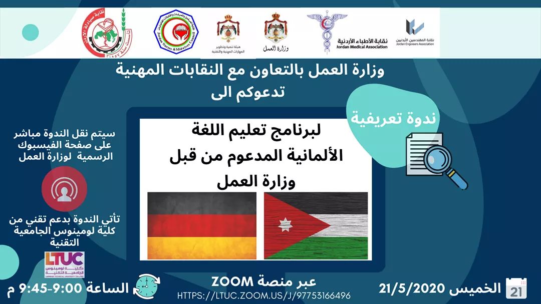 تدعوكم وزارة العمل وبالتعاون مع هيئة تنمية وتطوير المهارات المهنية والتقنية والنقابات المهنية الى ندوة تعريفية لبرنامج تعلم اللغة الالمانية يوم الخميس الموافق 21 / 05 / 2020 الساعة 9:00 الى الساعة 9:45 بحضور وزير العمل نضال فيصل البطاينه و نقباء كل من نقابة المهندسين الأردنيين ونقابة الأطباء الاردنية ونقابة الصيادلة الأردنية ونقابة الممرضين والممرضات والقابلات القانونيات.
