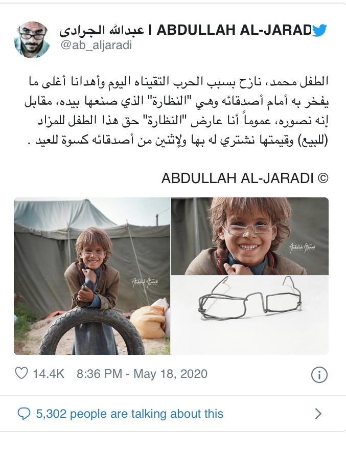 وتحولت النظارة إلى قصة إنسانية ملهمة بعد عرضها في مزاد إلكتروني على تويتر كان يقتصر في البدء على مساعدته وأسرته لشراء ثياب عيد الفطر القادم. وأعلن المصور اليمني عبدالله الجرادي، في منشور على صفحته في تويتر: