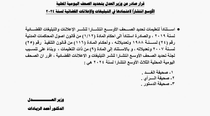 قرر وزير العدل الدكتور أحمد الزيادات أن الصحف اليومية المحلية الثلاث الأوسع انتشارا لسنة 2024 هي صحيفة الغد، وصحيفة الرأي، وصحيفة الدستور.ويأتي هذا الاجراء، لنشر الإعلانات والتبليغات القضائية، استنادا إلى تعليمات تحديد الصحف الأوسع انتشارا لسنة 2019.وبين القرار الصادر في عدد الجريدة الرسمية اليوم الخميس، أن تحديد الصحف الأوسع انتشارا جاء بناء على تنسيب لجنة تحديد الصحف الأوسع انتشارا لنشر التبليغات والإعلانات القضائية.