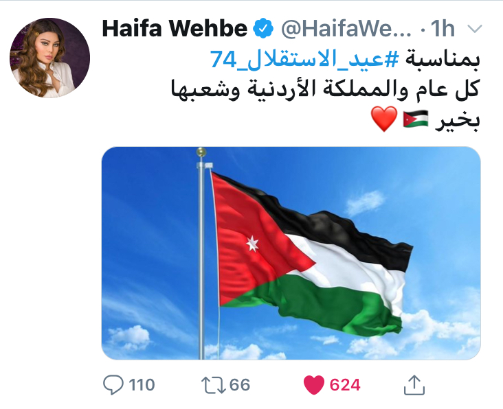 نشرت النجمة اللبنانية هيفا وهبي تغريدة عبر حسابها الرسمي على تويتر تهنئة للاردن وشعبها بمناسبة الذكرى 74 لعيد الاستقلال جاء فيها :