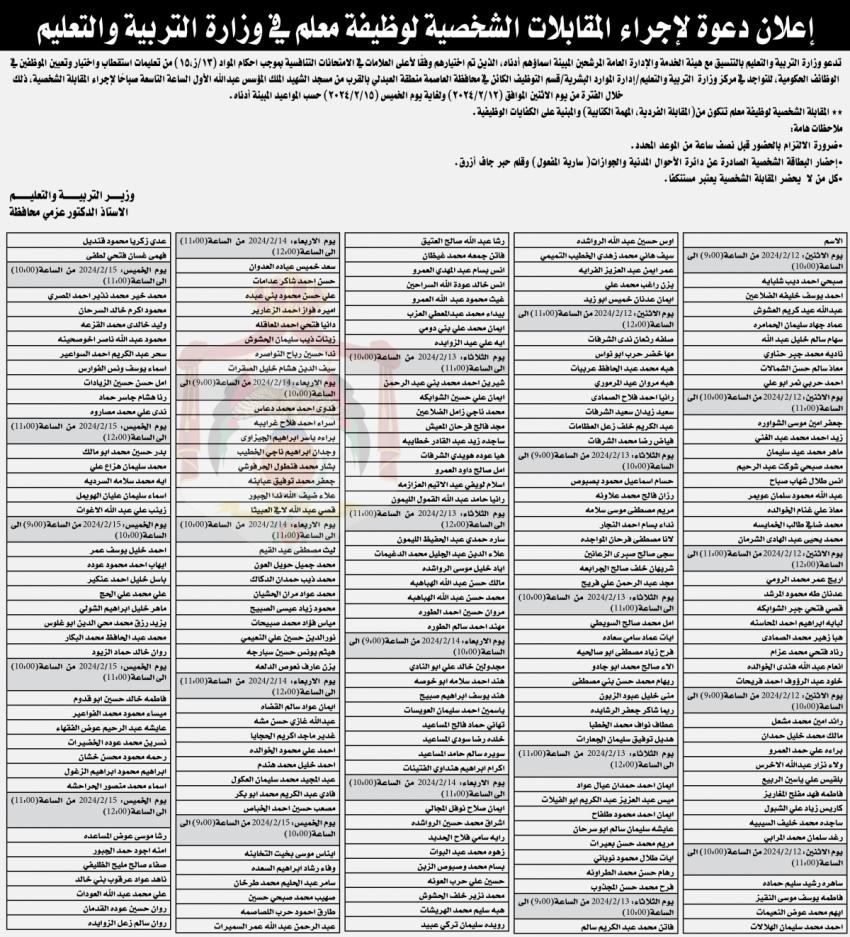 دعت وزارة التربية والتعليم وبالتنسيق مع هيئة الخدمة والادارة العامة التالية أسماؤهم لحضور المقابلات الشخصية.وتاليا التفاصيل والأسماء :